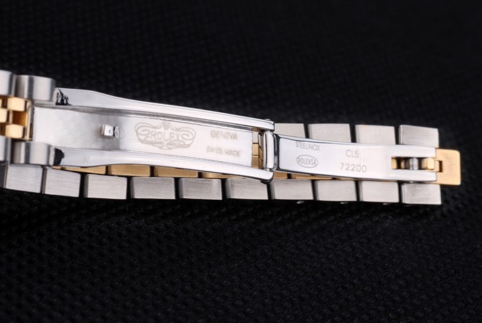 Armbånd: To tonet linkarmbånd i børstet rustfrit stål og 18k gul forgyldt stål med Rolex gravering skjult lås, der viser Rolex logo