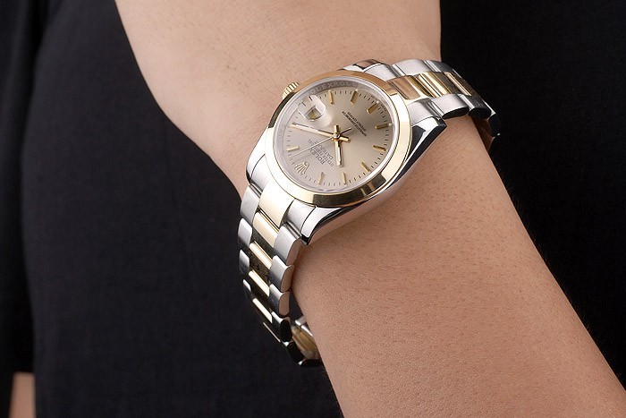 Armbånd: To tonet linkarmbånd i børstet rustfrit stål og 18K gul forgyldt stål med Rolex Gravering Fold-in Deployment Clasp Visning af Rolex Logo