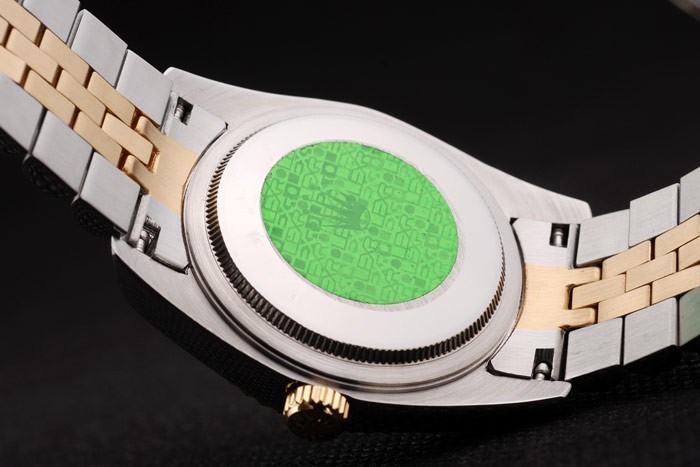 Tilbage: Skub i rustfrit stål tilbage med grønt Rolex Klistermærke og markeringer