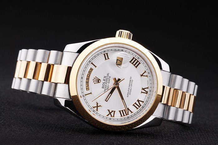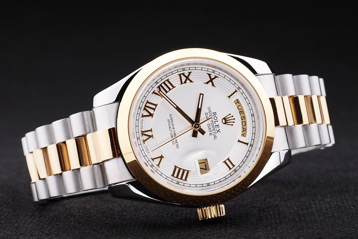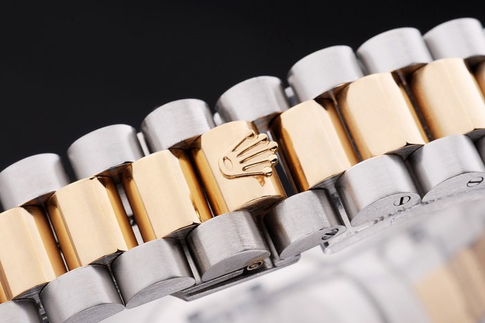 Armbånd: Børstet rustfrit stål og gul guld link kæde med fold over lås og rolex krone gravering