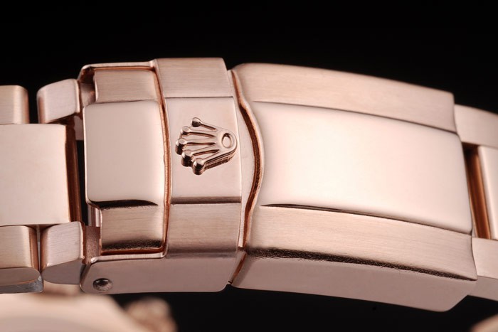 armbånd: 18k rose forgyldt rustfrit stål link armbånd med Rolex indgraveret fold-in implementering lås visning af Rolex logo