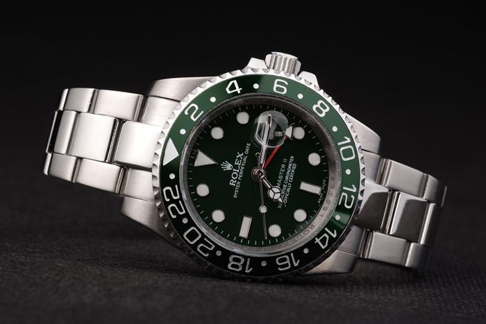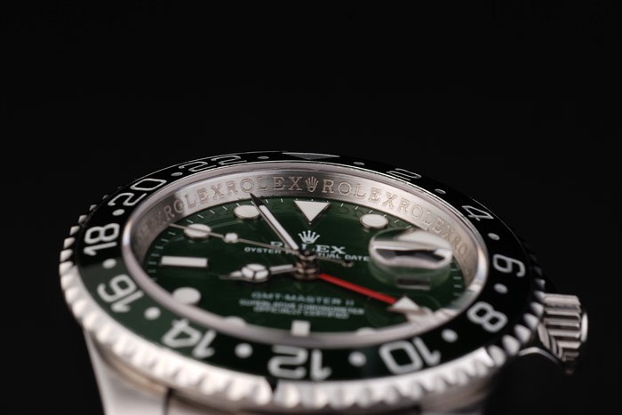 Tilbage: Skub i rustfrit stål tilbage med grønt Rolex Klistermærke og markeringer