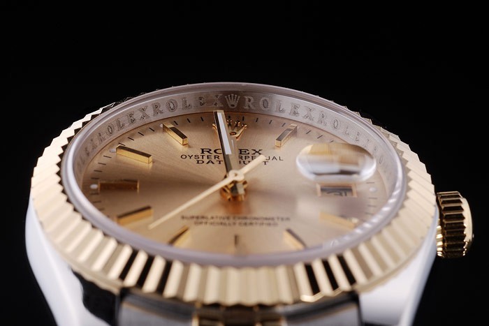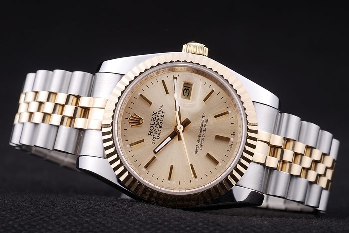 Armbånd: Børstet rustfrit stål og gul guld link armbånd med Rolex logo skjult lås