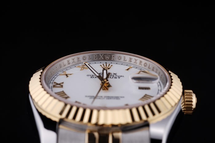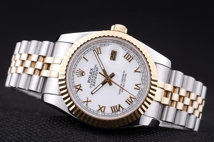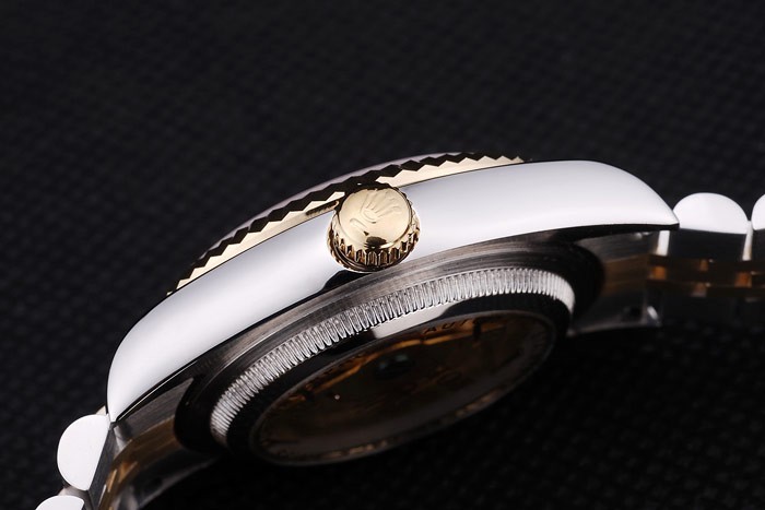Armbånd: Børstet rustfrit stål og gul guld link armbånd med Rolex logo skjult lås