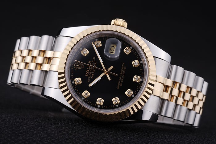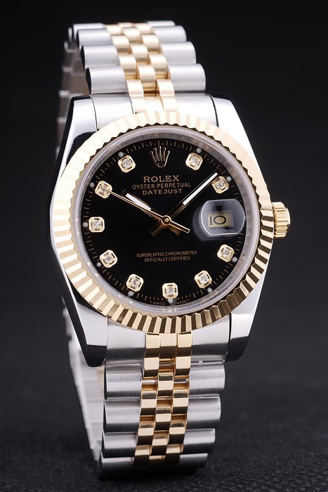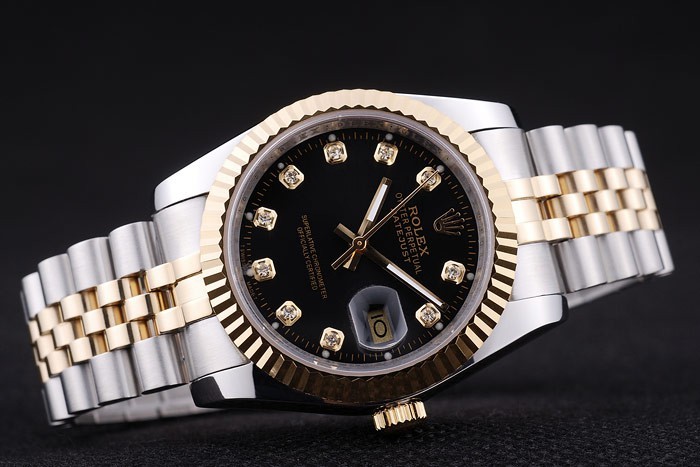 Armbånd: Børstet rustfrit stål og gul guld link armbånd med Rolex logo skjult lås