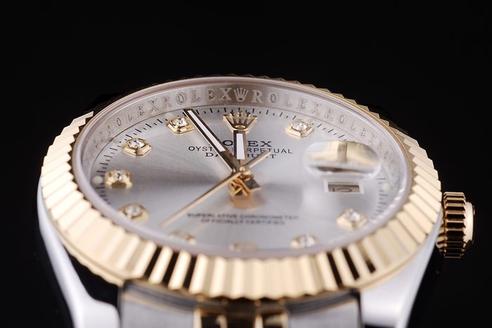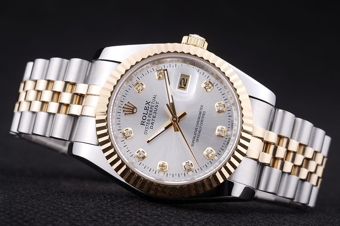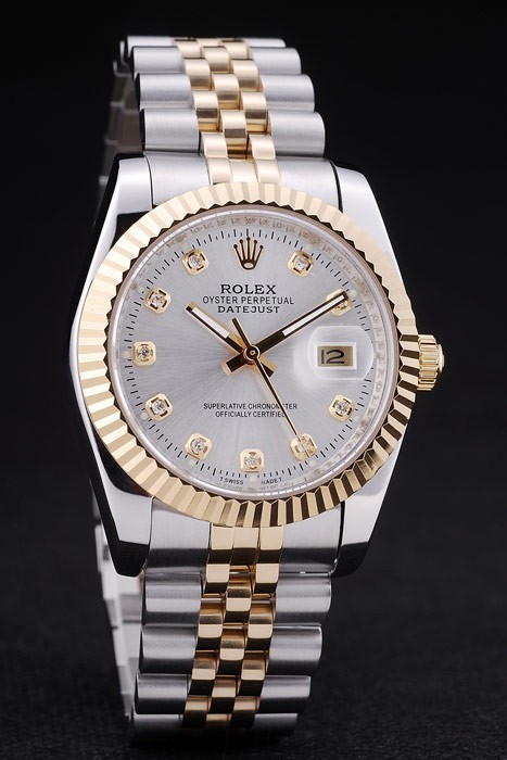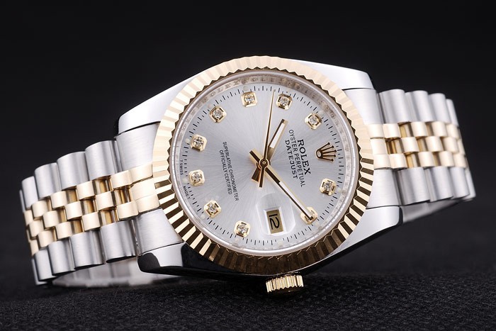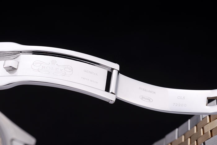 Armbånd: Børstet rustfrit stål og gul guld link armbånd med Rolex logo skjult lås