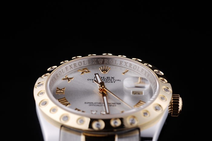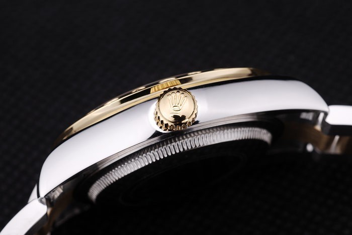 Armbånd: Børstet rustfrit stål og gul guld link armbånd med Rolex logo implementering lås
