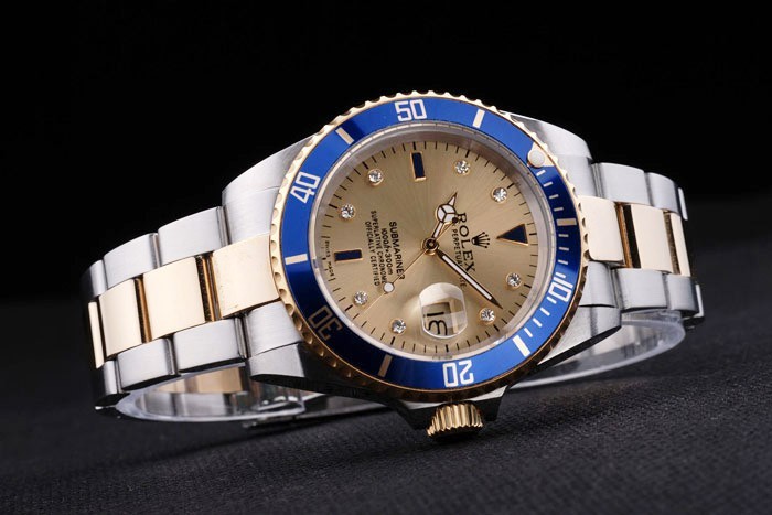 bezel: Gold-tone cutwork bezel med lysende blå emalje minutter markeret top