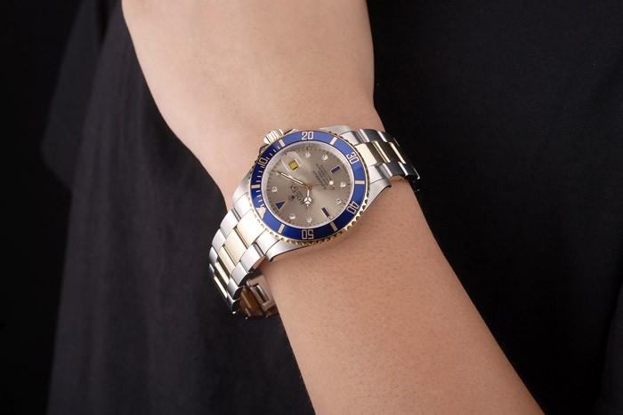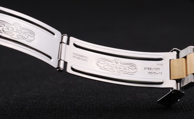 Armbånd: To tonet børstet og guld tone rustfrit stål link armbånd med Rolex gravering fold i lås, der viser Rolex logo