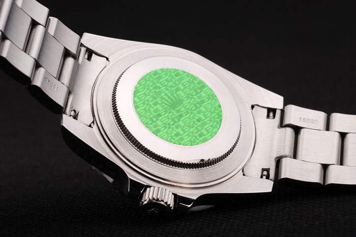 Tilbage: Skub i rustfrit stål tilbage med grønt Rolex Klistermærke og markeringer