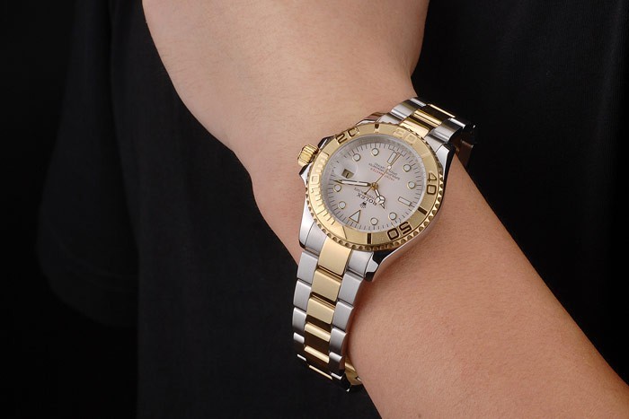 Armbånd: To tonet børstet og guld tone rustfrit stål link armbånd med Rolex gravering fold i lås, der viser Rolex logo