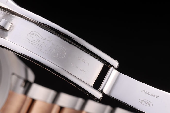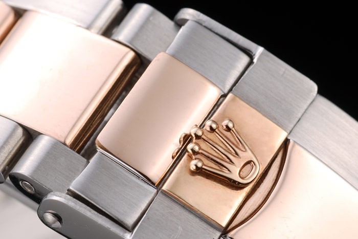 Crown: 18k Rose-Gold Cutwork Crown med Rolex logo og to mindre cutwork push-knap kroner på begge sider af det