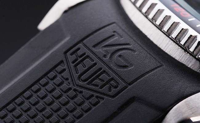 Armbånd: Textured Black Gummi-rem med varmeprægede frimærke Tag Heuer og indgraveret Hook-Buckle Clasp