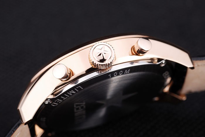 Crown: Rose-Gold Plated Cutwork Crown med Zenith Star Logo Gravering og to mindre runde trykknapper på begge sider af den Taske tykkelse: 12 mm